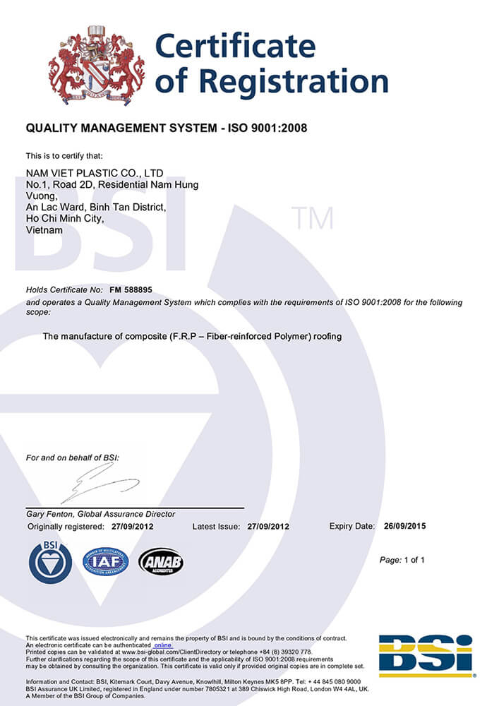 Công ty TNHH SX-TM Nhựa Nam Việt vừa đạt được chứng nhận ISO 9001:2008 - tiêu chuẩn quốc tế toàn cầu về hệ thống quản lý chất lượng do Công ty BSI Việt Nam cấp. Chứng nhận được dựa trên kết quả đánh giá của quá trình xây dựng và triển khai đồng bộ hệ thống quản lý chất lượng của Nhựa Nam Việt theo các quy định nghiêm ngặt của tiêu chuẩn ISO 9001:2008. Việc đạt chứng nhận này đánh dấu một bước phát triển mới trong quá trình sản xuất và quản lý chất lượng đối với việc đáp ứng yêu cầu ngày càng cao về chất lượng sản phẩm từ khách hàng của Nam Việt.