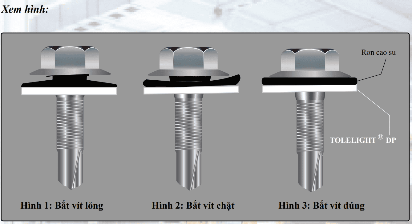 Khi sử dụng vít cần phải bắt đúng vị trí và dùng một lực vừa phải nhằm không làm biến dạng con ron và bề mặt tấm lợp.