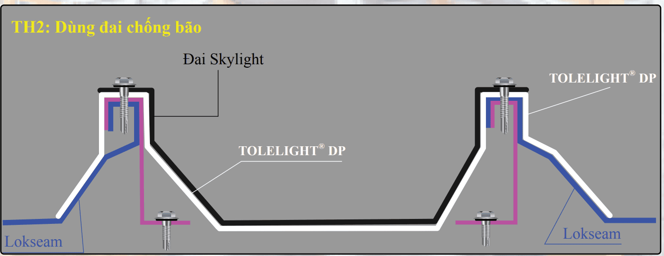 Trong trường hợp tấm lợp lấy sáng được sử dụng trong vùng có gió bão, nên sử dụng theo những phụ kiện đi kèm trong quá trình lợp nhằm gia cố chắc chắn thêm cho tấm lợp được vững chắc không bị bào mòn ngay vị trí của con vít đi qua.