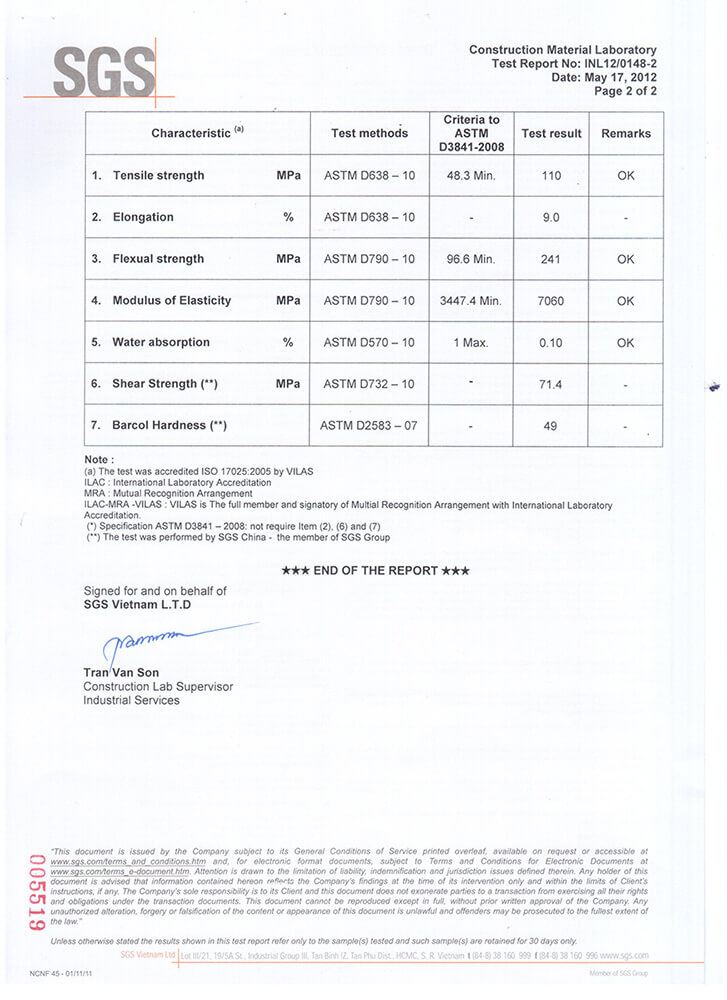 Kết quả kiểm nghiệm một số chỉ tiêu theo ASTM D3841 - 02