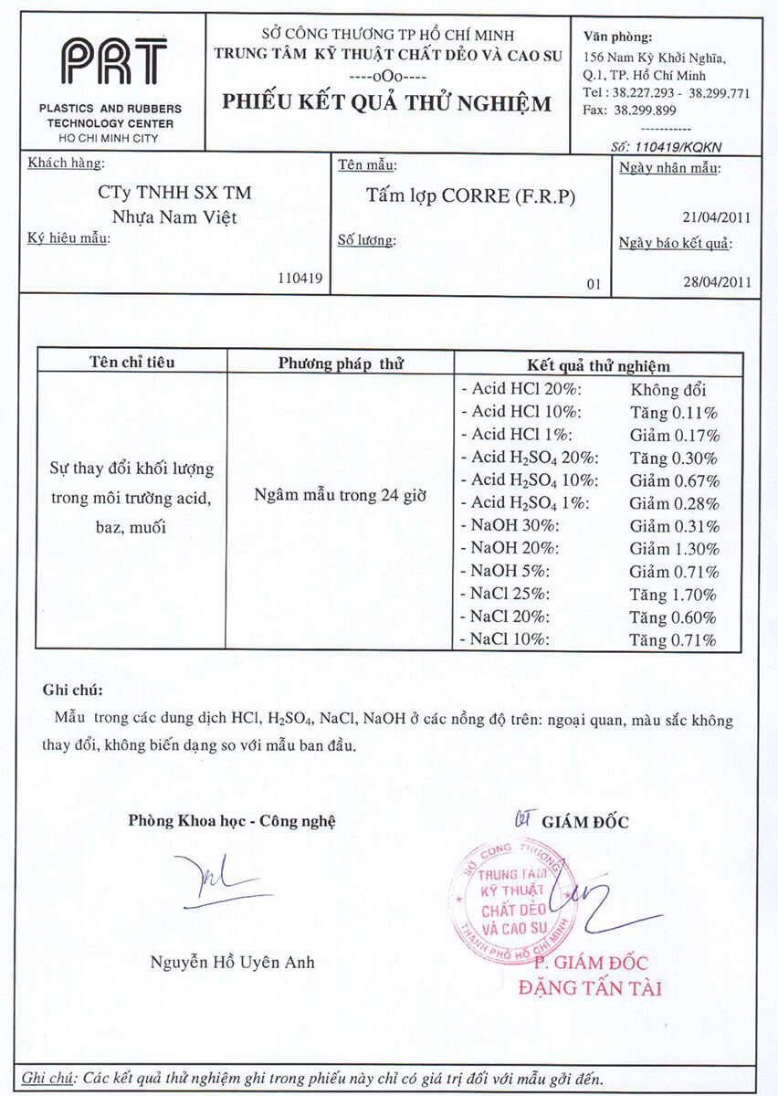 Kết quả kiểm nghiệm sự thay đổi trong môi trường hóa chất của tấm lợp CORRE sau 24 giờ