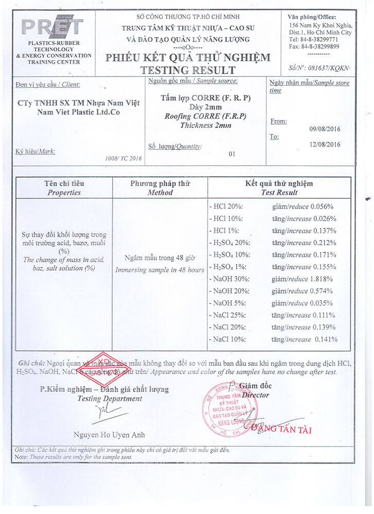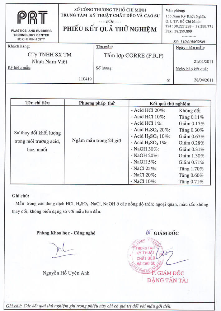 Dựa trên kết quả này, các nhà khoa học đưa ra bảng xếp hạng kháng dung môi hữu cơ của các loại tôn nhựa như sau: FRP>PVC>ABS. Nhiều nghiên cứu khác cũng chỉ ra rằng nhựa Composite chịu được sự tấn công của dung môi tốt hơn pvc.