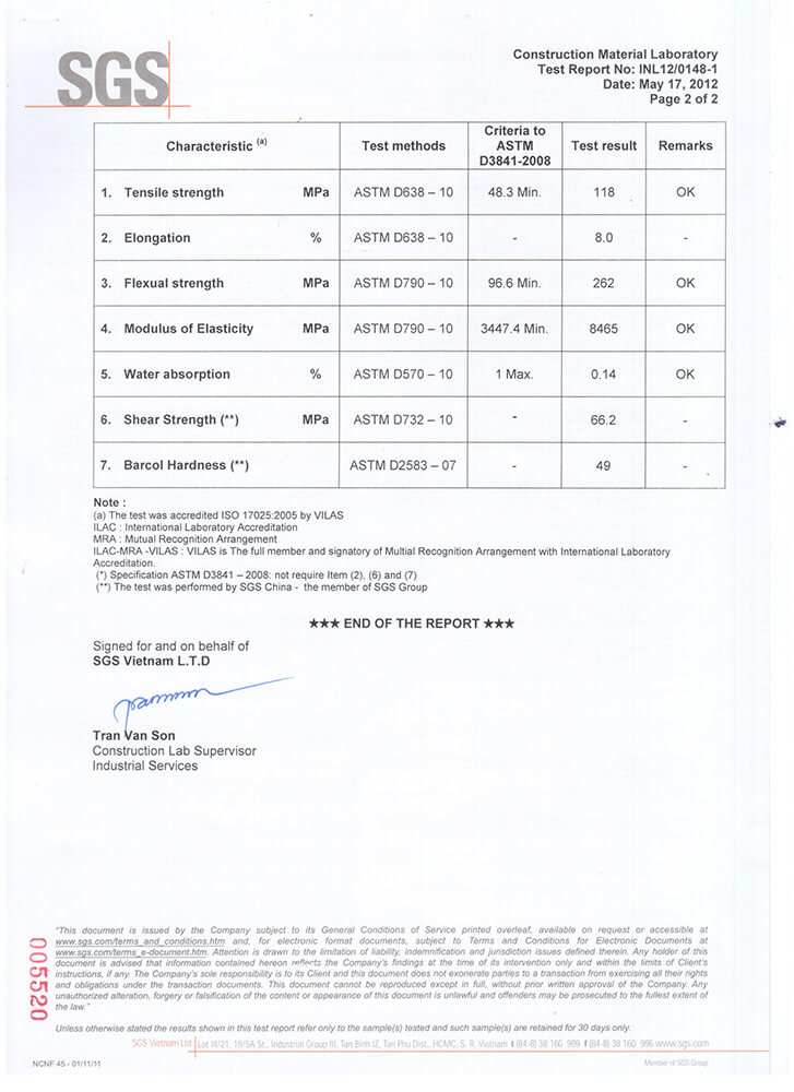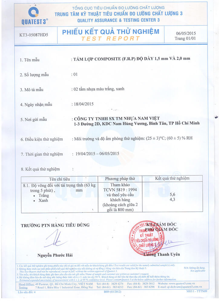 Kết quả thử nghiệm độ võng với tải trọng tĩnh được cấp bởi Trung tâm Kỹ Thuật Tiêu Chuẩn đo lường chất lượng 3 (QUATEST3).