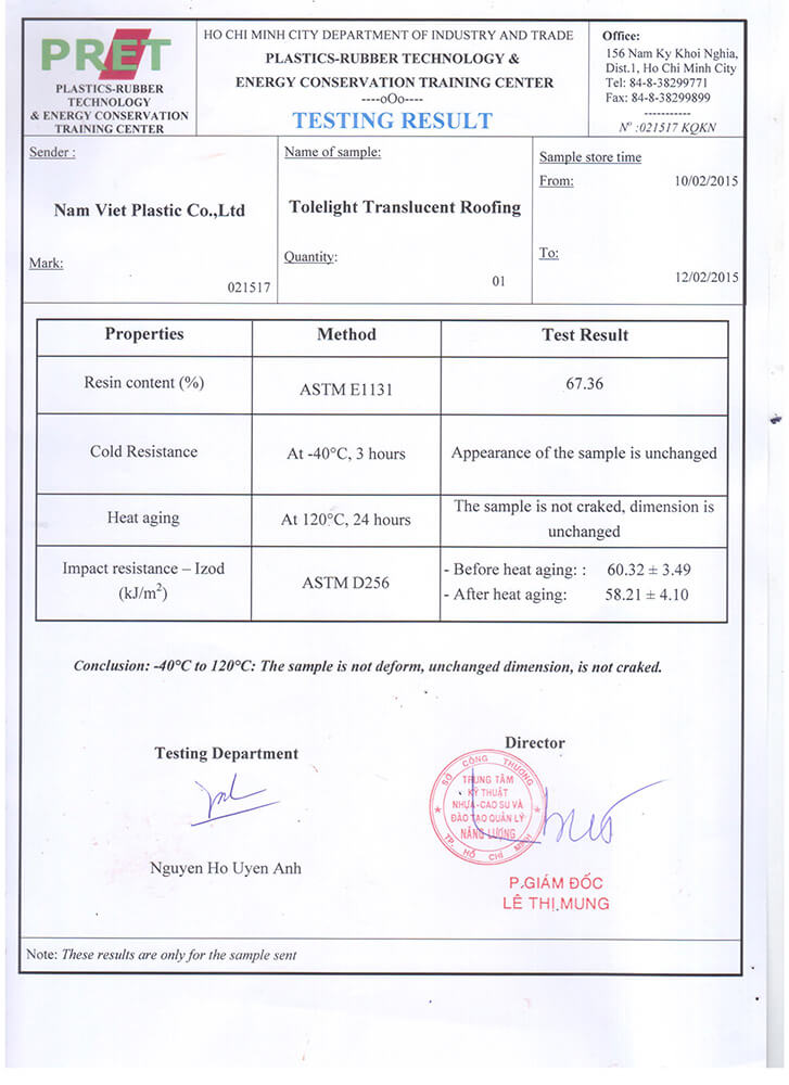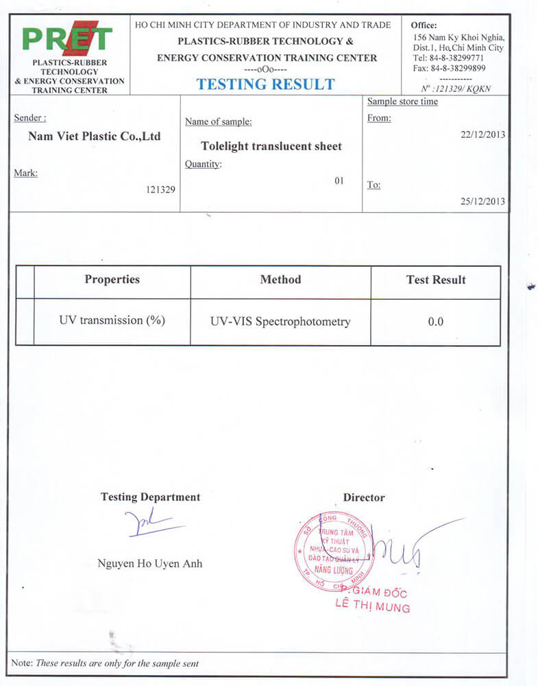 Kiểm nghiệm chống tia cực tím, tia UV (lượng tia UV xuyên qua là 0%) cấp bởi Trung tâm Kỹ thuật nhựa - cao su và đào tạo quản lý năng lượng (PRET)