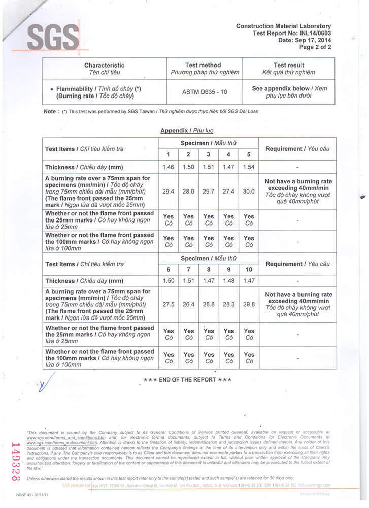 Kiểm nghiệm tính cháy cấp bởi SGS