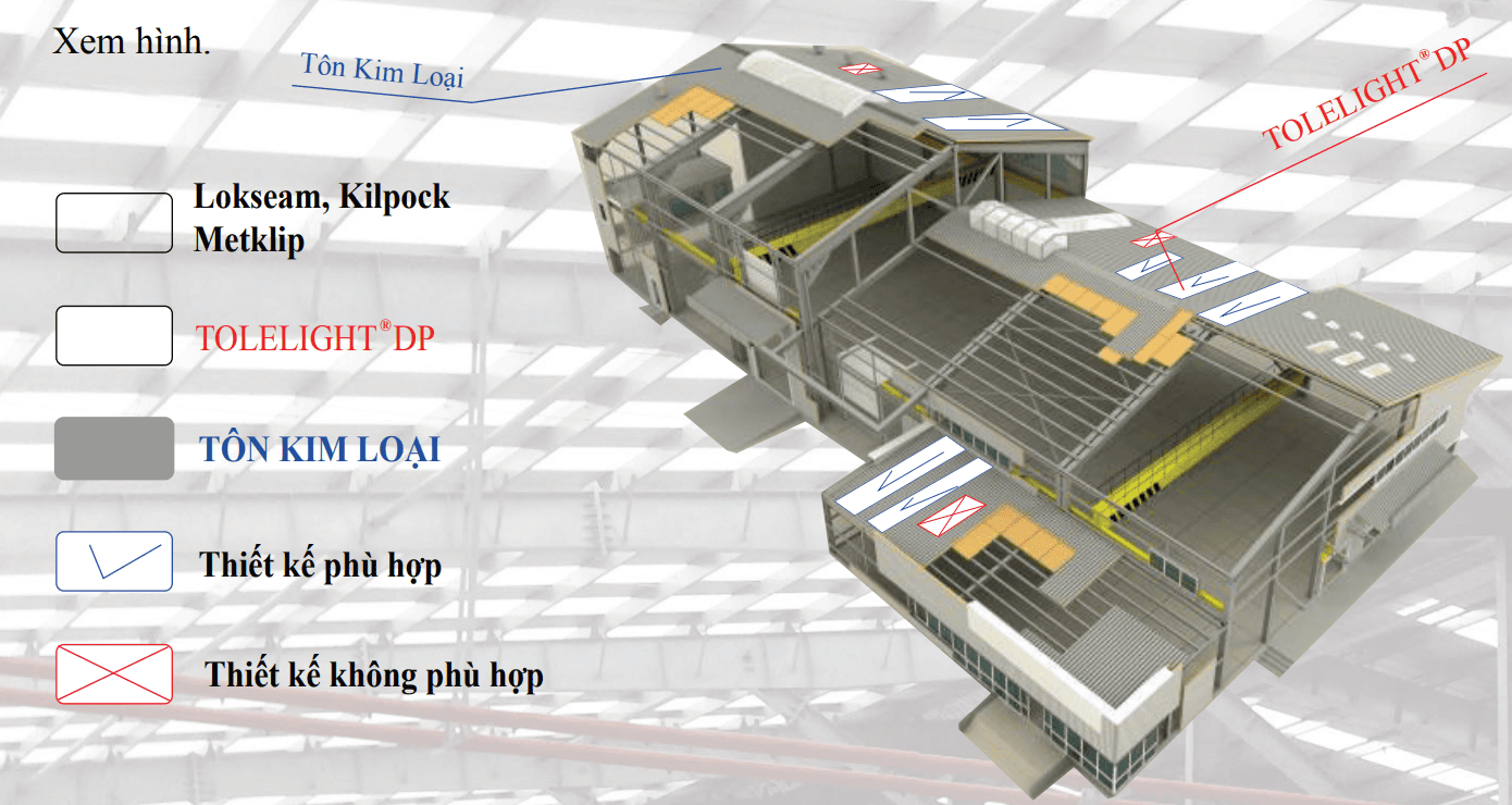 Chỉ riêng trường hợp đặc biệt của một vài loại sóng như Lokseam, Metklip, Kliplock , khi thiết kế lấy sáng mái đặc biệt lưu ý về thiết kế.