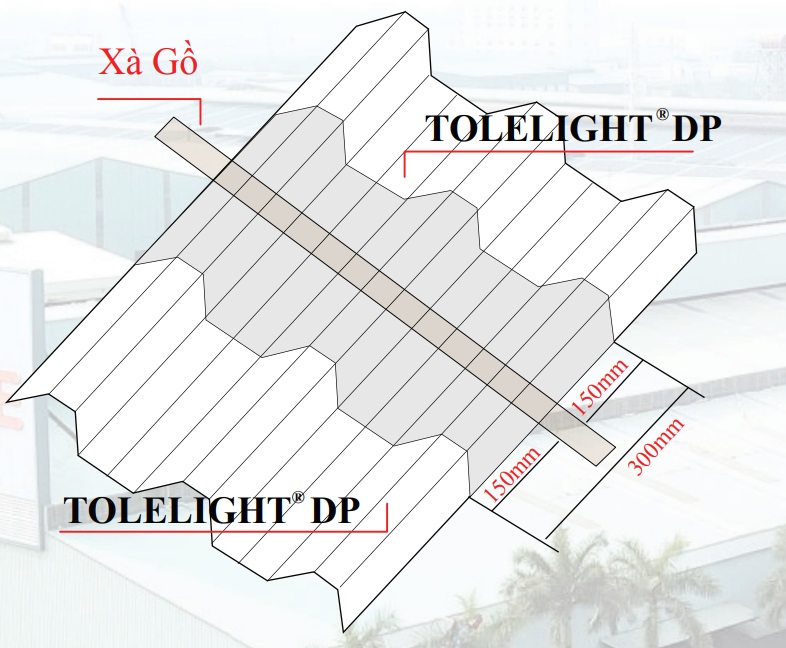 - Điểm nối giữa tấm lợp lấy sáng và tấm lợp kim loại tối thiểu từ 300mm- 400mm.